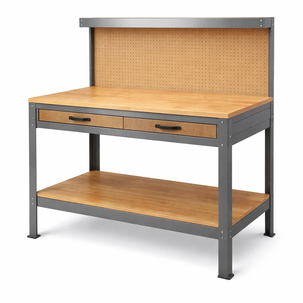 Dispone de dos cajones y un estante inferior para almacenamiento. Incluye un tablero perforado para facilitar el uso de herramientas.