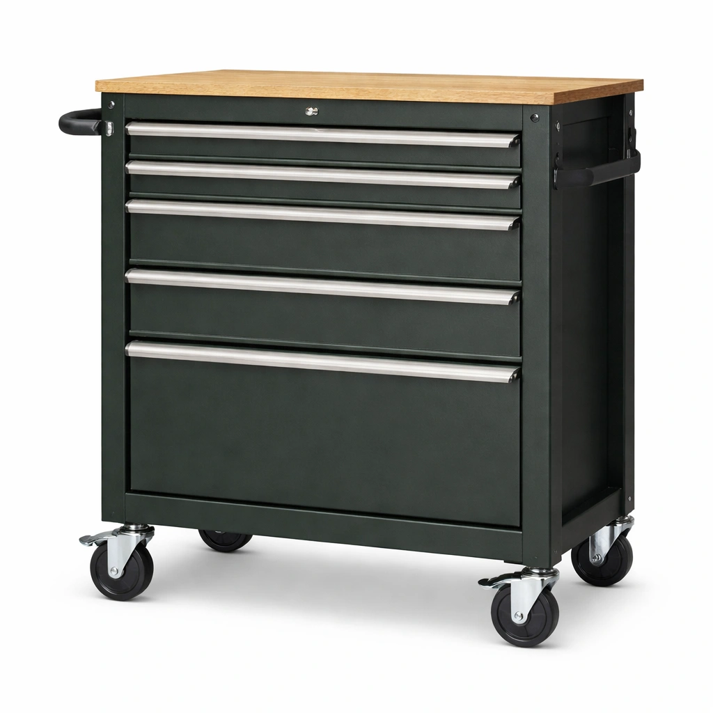 Carro de herramientas de acero con encimera de madera verde